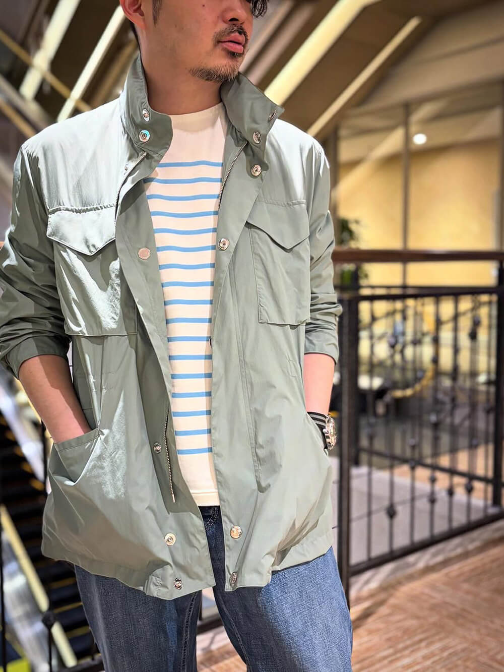 マッキントッシュのM-65ジャケットはなんとも言えないブルーグリーンのニュアンスカラーとドロップショルダー・ゆとりのあるフィッティングが"なう"な雰囲気醸し出しております。