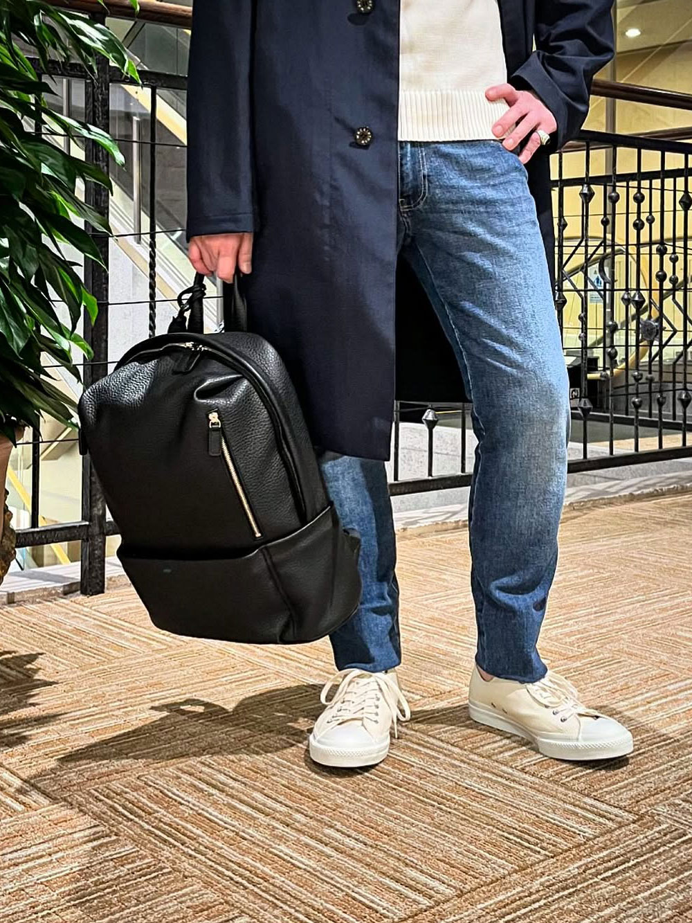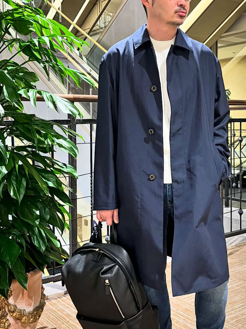 ステンカラーのスプリングコートをカジュアルに着崩したコーデ。