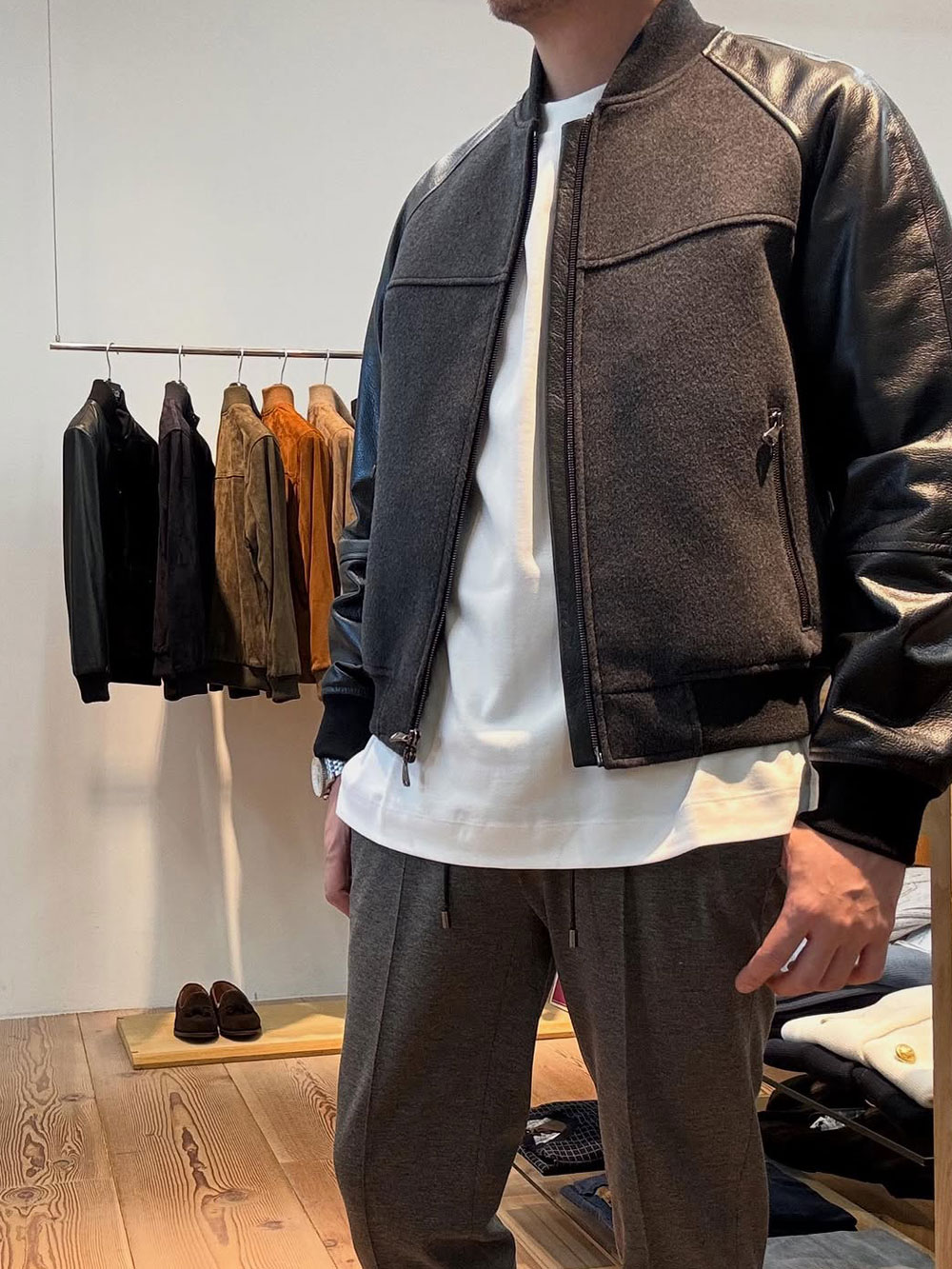カーフのシュリンクレザーとウルカシのボディに加えてブラック×チャコールグレーの配色が大人見えしてくれるスタジャン。