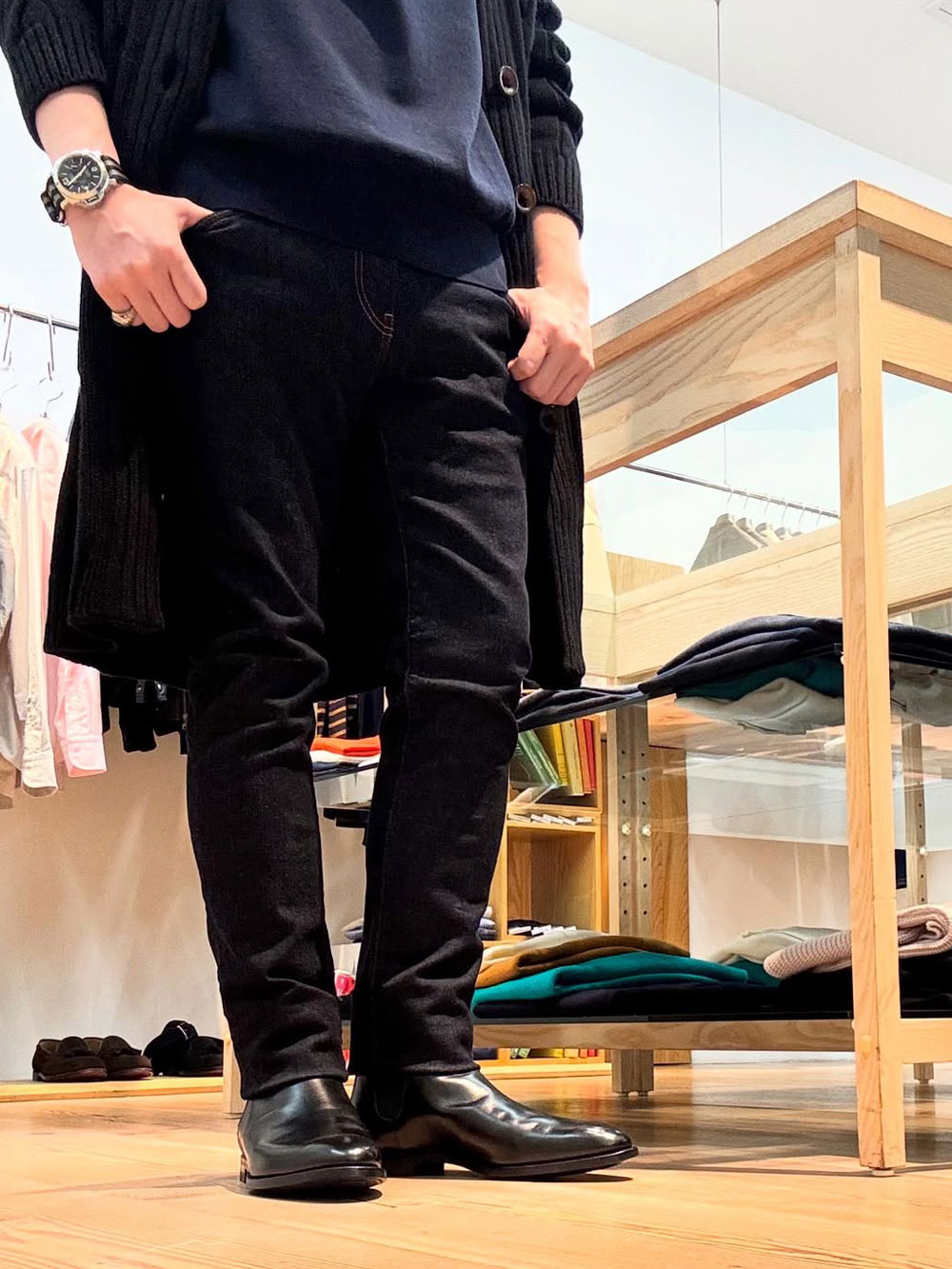 セッテフィーリのショールガウンを主体にネイビー×ブラックなモダンなカラーでコーディネートしたカジュアルスタイルです。 縦長に見えるガウンにPT TORINO DENIMの"SWING"で更にスッキリと、足元はブーツで秋冬らしくまとめています。