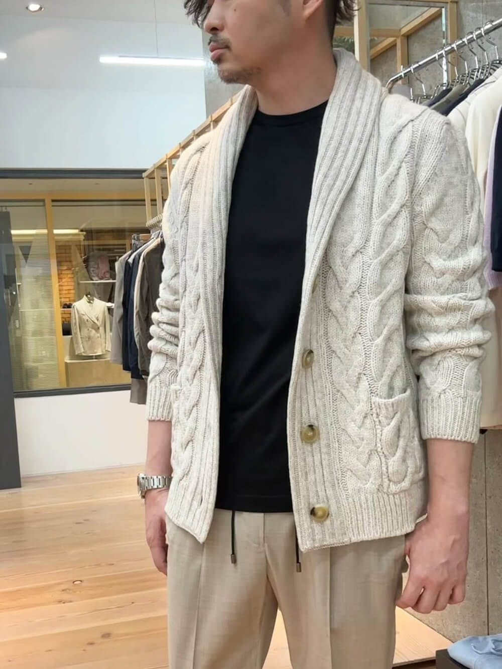 セッテフィーリのショールカーディガンを使ったエレガントなカジュアルスタイル。