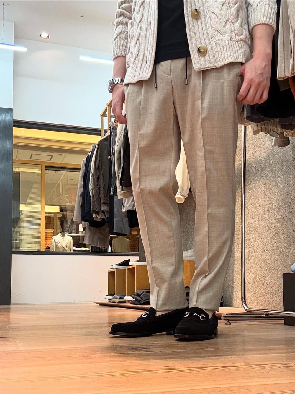 インナーはサンスペルのカットソーでラフに合わせていますが、ジャブスのパンツはテクノウール、足元はビットローファーで上品な仕上がりを意識しました。