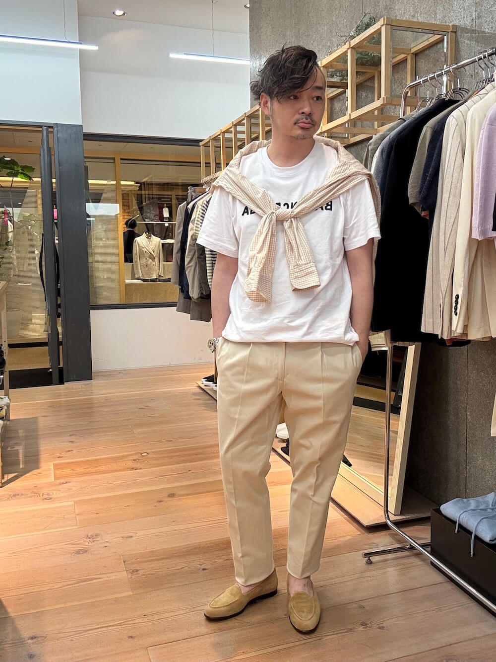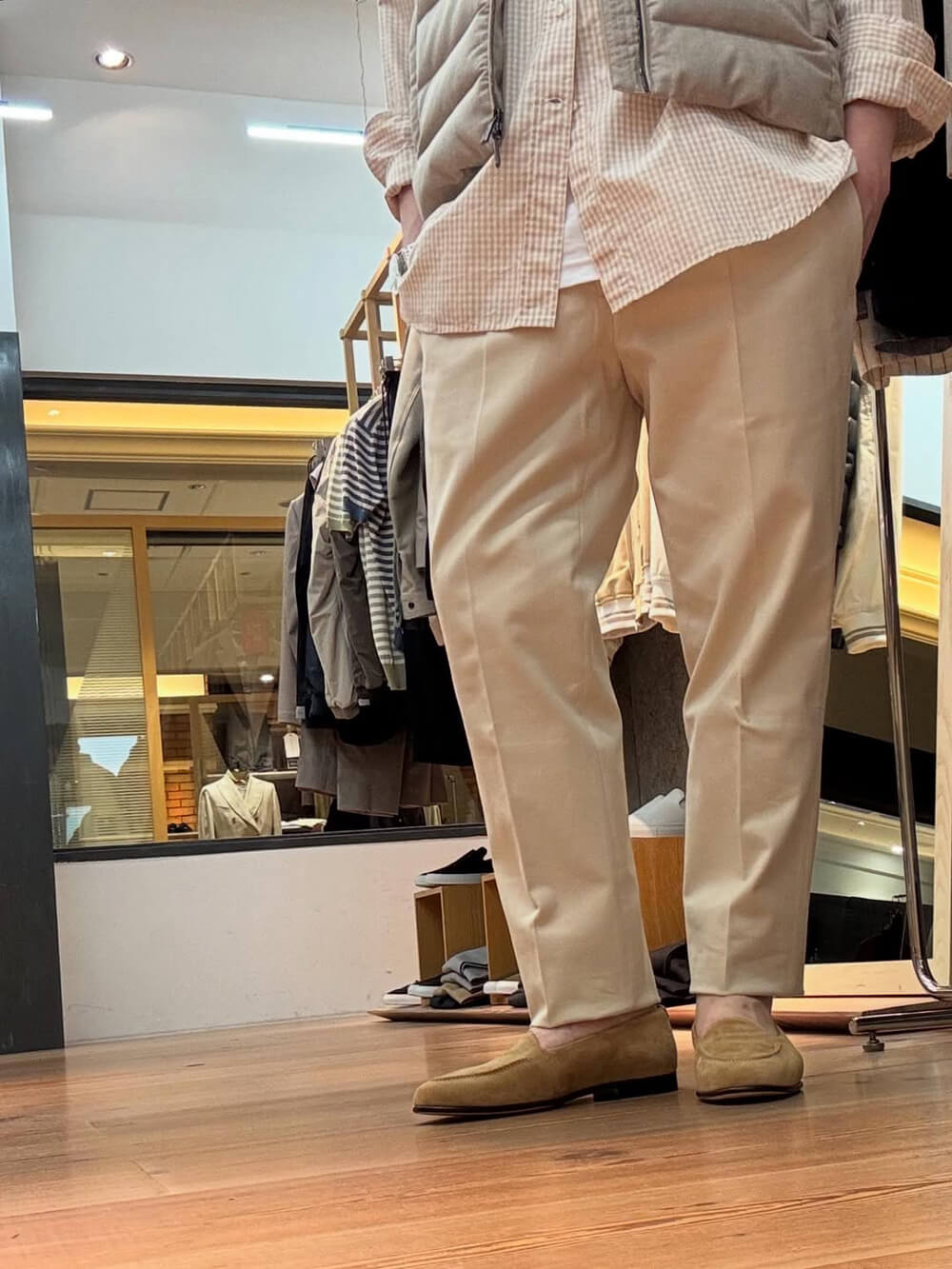 カットソーにカジュアルシャツといった軽快なスタイルに、ダウンベストはウーリーな素材で秋冬感を演出。チノのスラックスにローファーで上品さをキープしています。