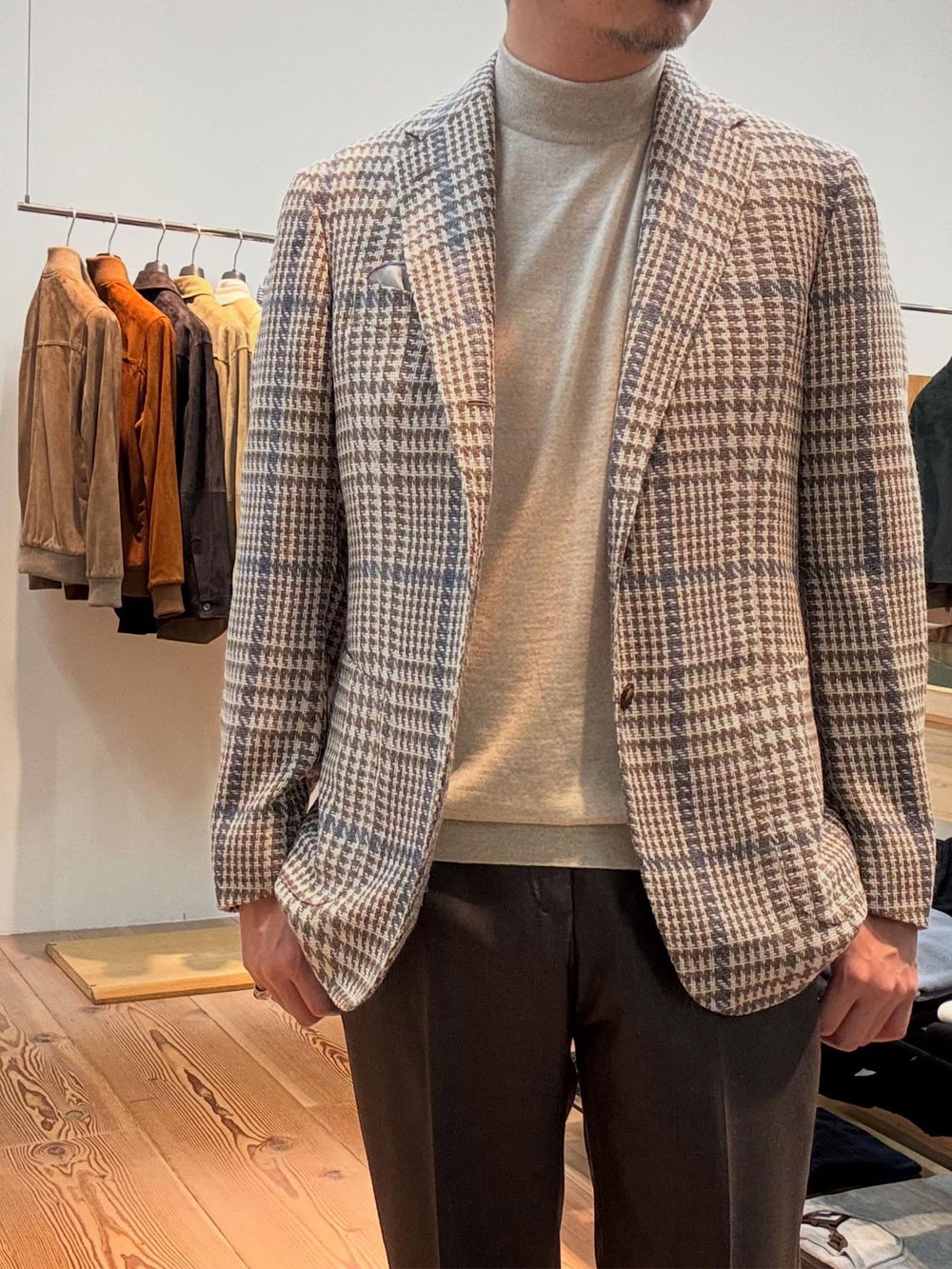 グレージュのチェックにブルーのペーンが入ったジャケットはラティーノでしかないエクスクルーシブファブリック。