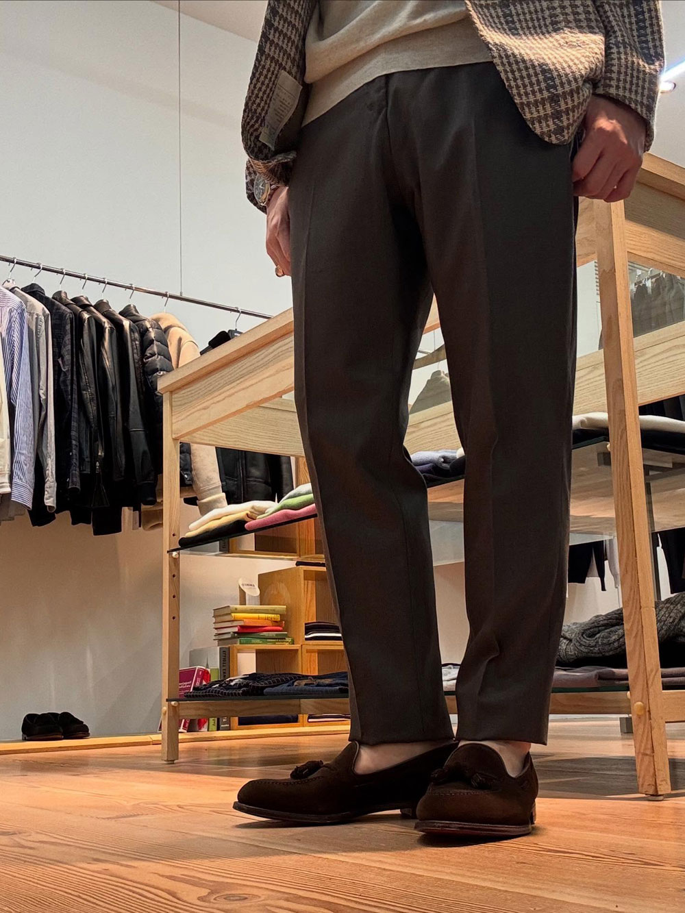 ジャケットが目を引くので他のアイテムはできるだけ控えめに、、、ジョンスメのグレージュのモックネックで色目を拾って、パンツとシューズはダークブラウンでスッキリとシックに見せています。