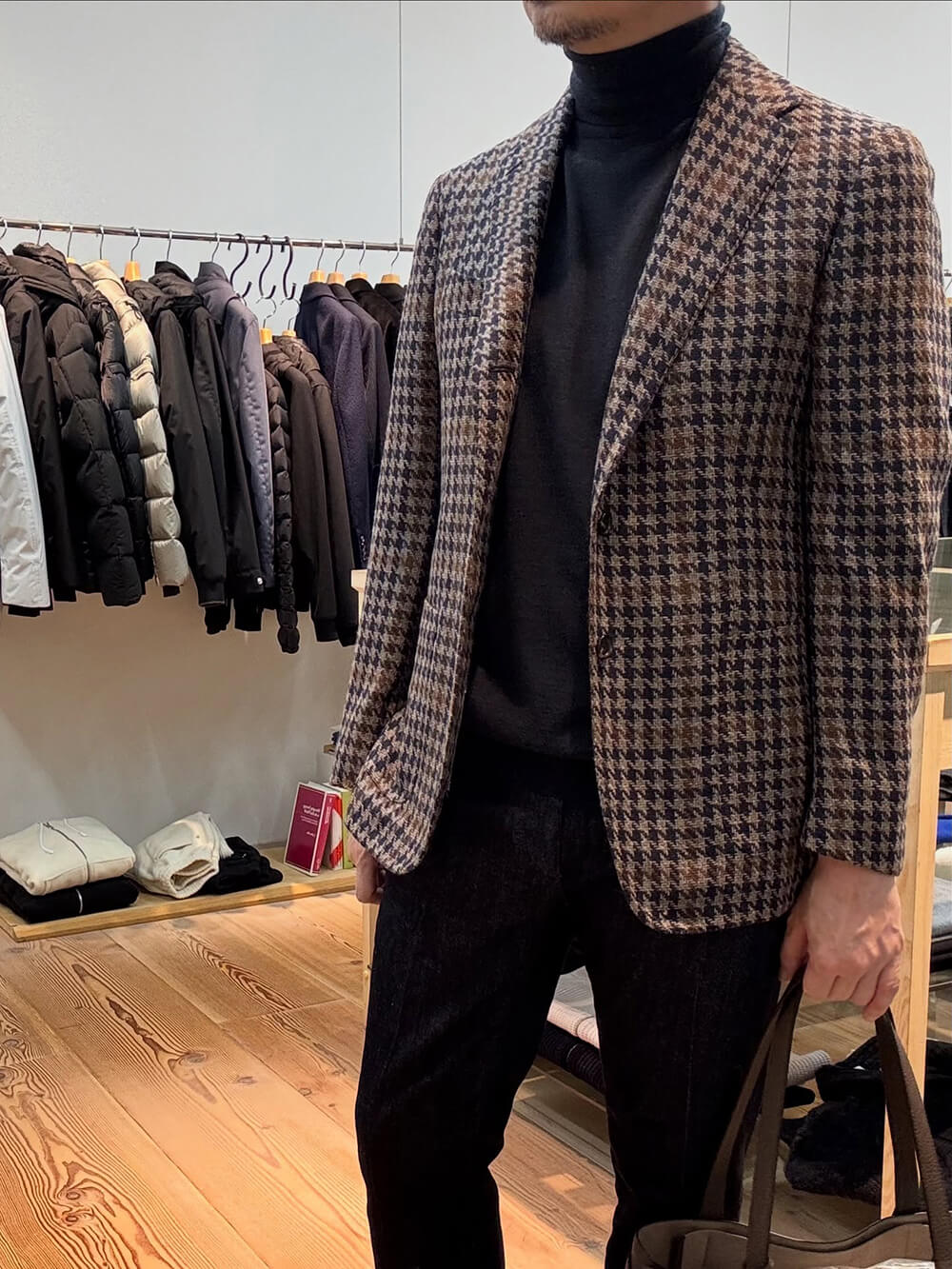 グレイッシュブラウンのメランジをベースにネイビー・ブラウンの大きめなハウンドトゥースがキャッチーなジャケットは他ではお目にかかることのできないラティーノエクスクルーシブファブリック!