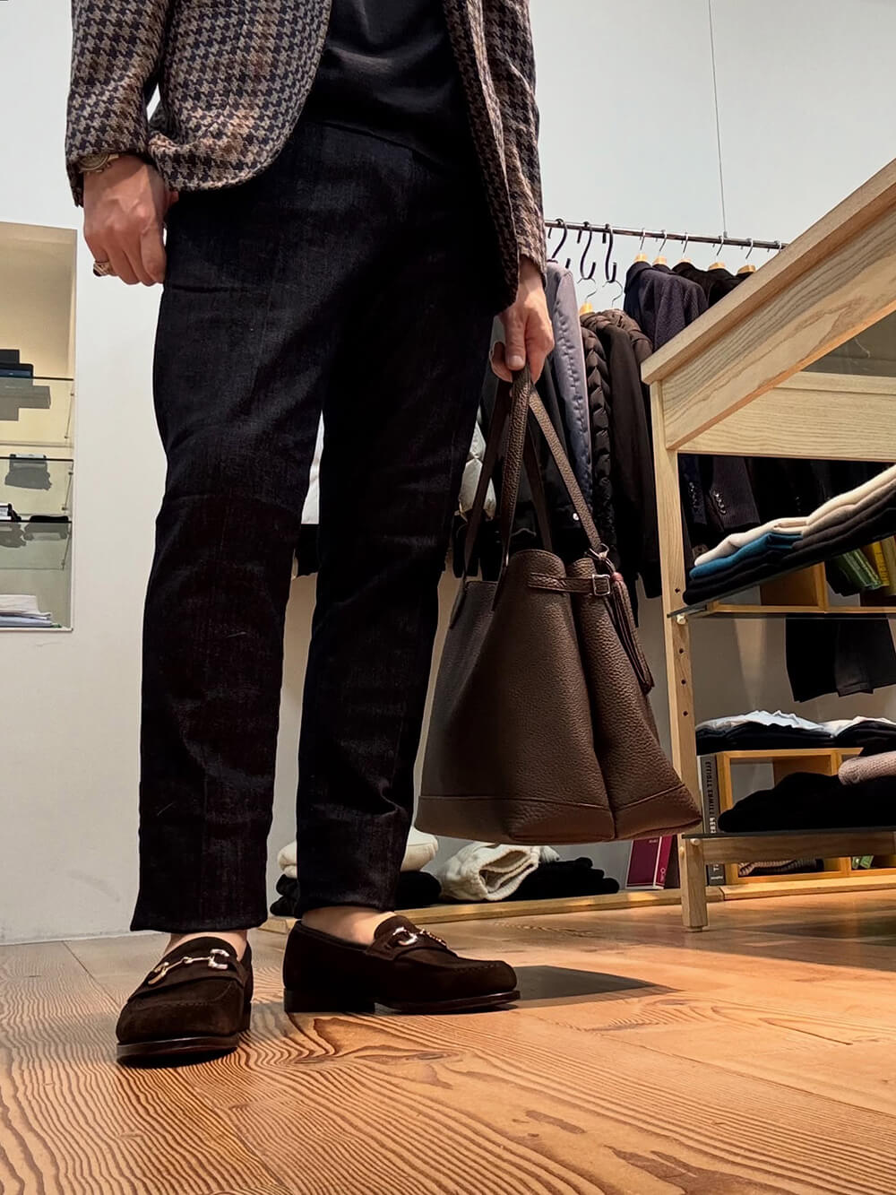 インナー・パンツはジャケットのダークネイビーを拾って、シューズとバッグはダークブラウンで纏めています。