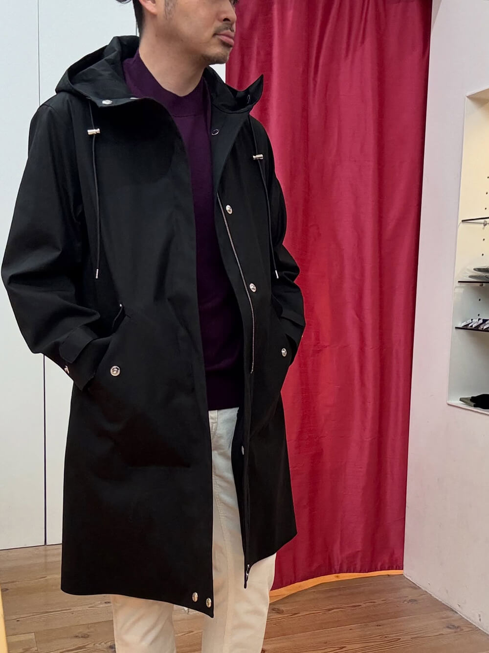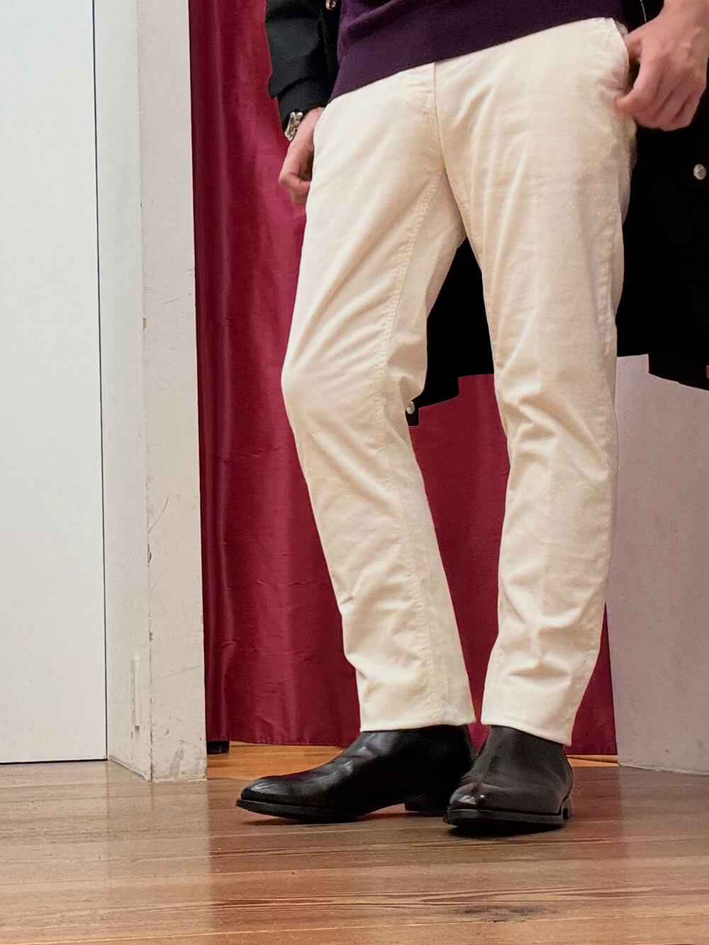 インナーにはパープルのニットを差し色に、ホワイトのコーデュロイ、ブラックカーフのブーツでモノトーンに合わせました。