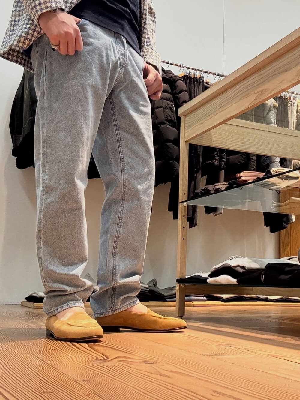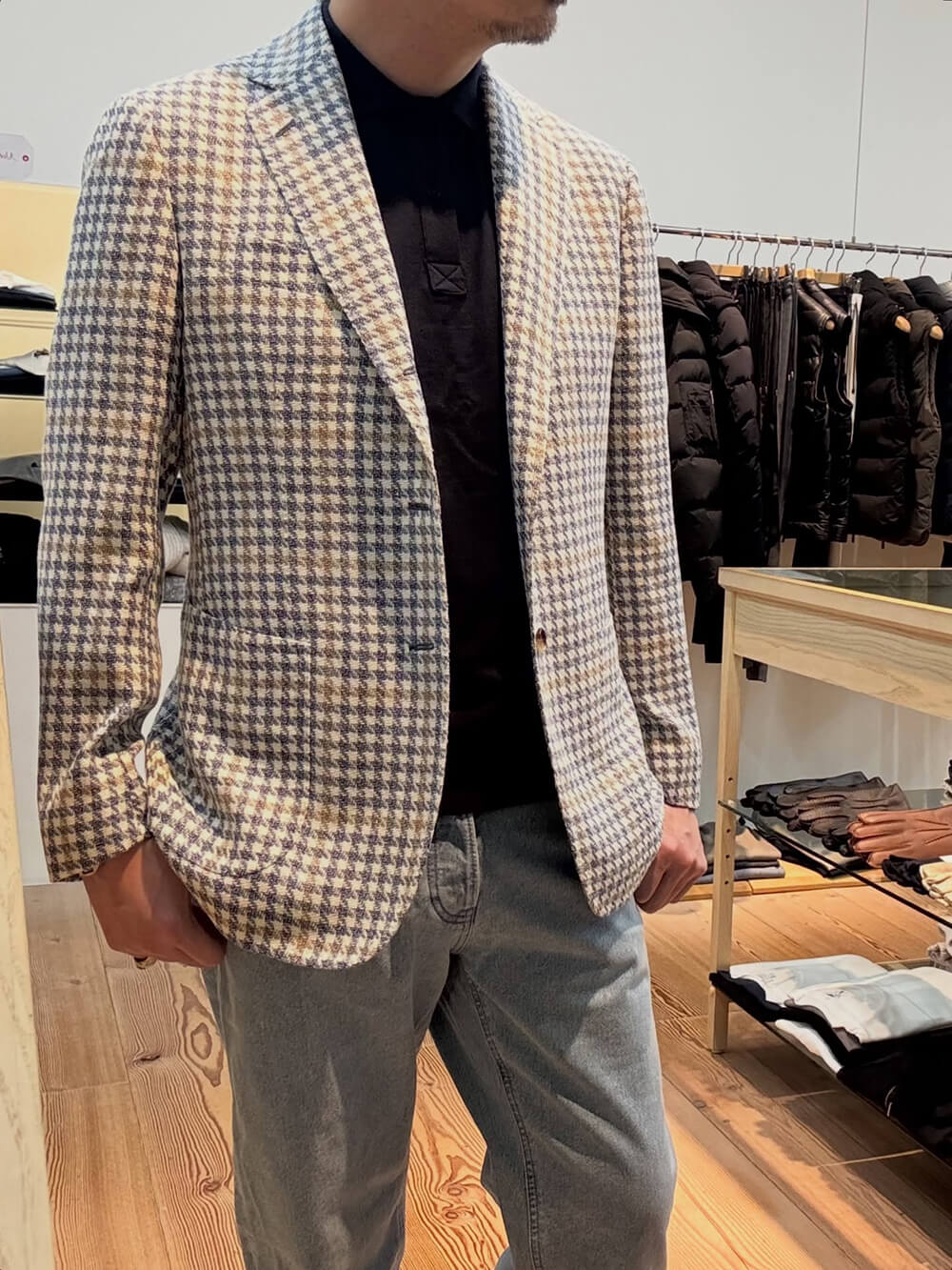 大きめのハウンドトゥースがキャッチーなラティーノのジャケットはサックスブルーに淡いイエローが春らしいテンションの上がるカラー。シルク・リネン・コットンの3者混が涼しげな雰囲気。インナーはネイビーのポロで控えめに、パンツはPT DENIMのレベルで敢えてルーズに、足元はペーンのイエローを拾ってガスパリーニのローファーを上品に合わせました。