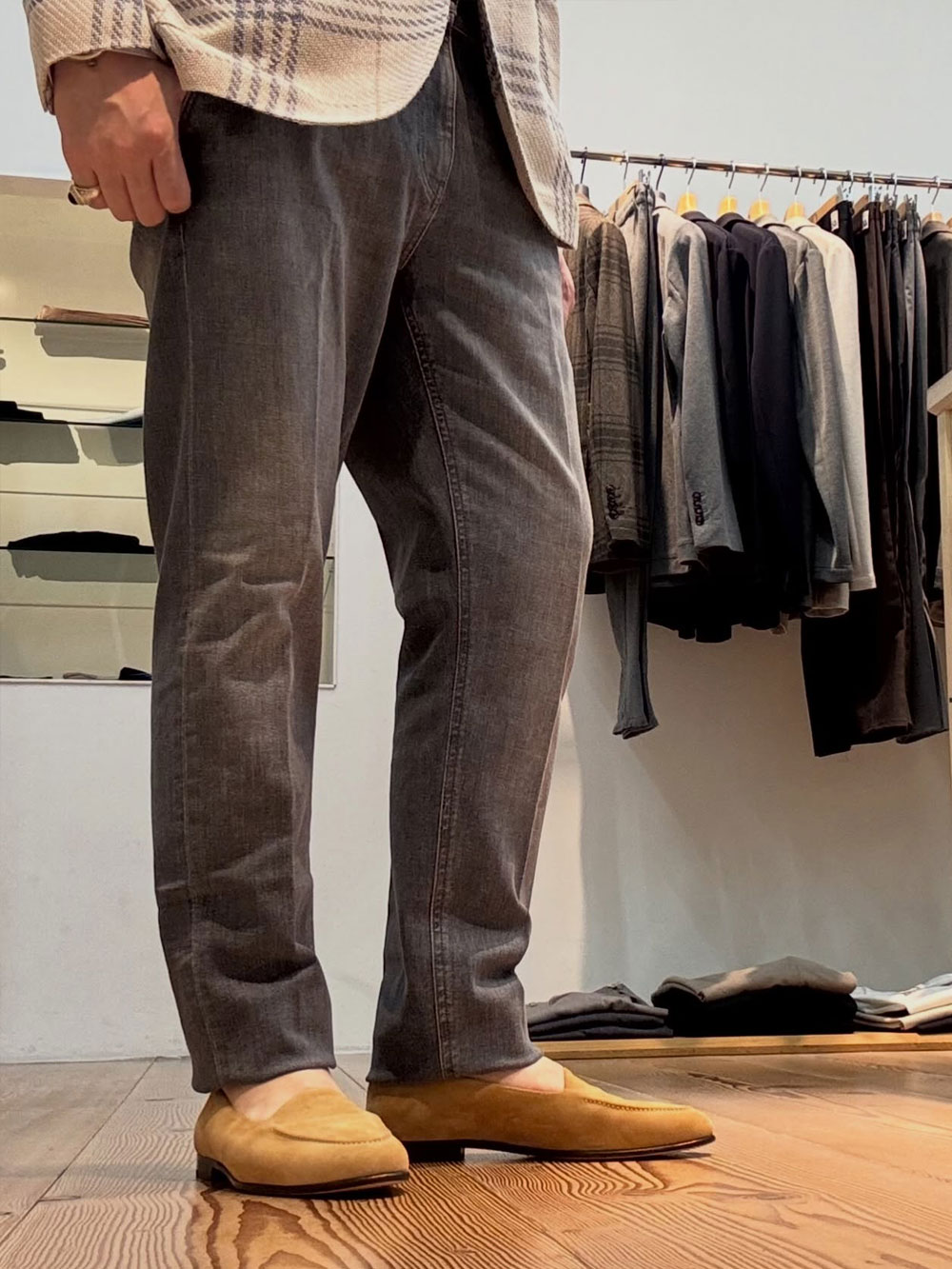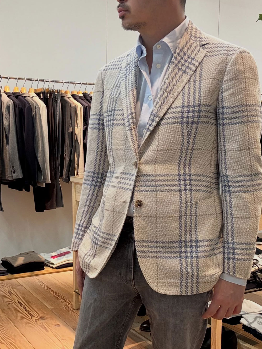 ジャケットはラティーノの大柄のチェック、ペーンのブルーを拾ってブルーのシャツ、パンツはデニムですがスラックス型なので上品さをキープ。