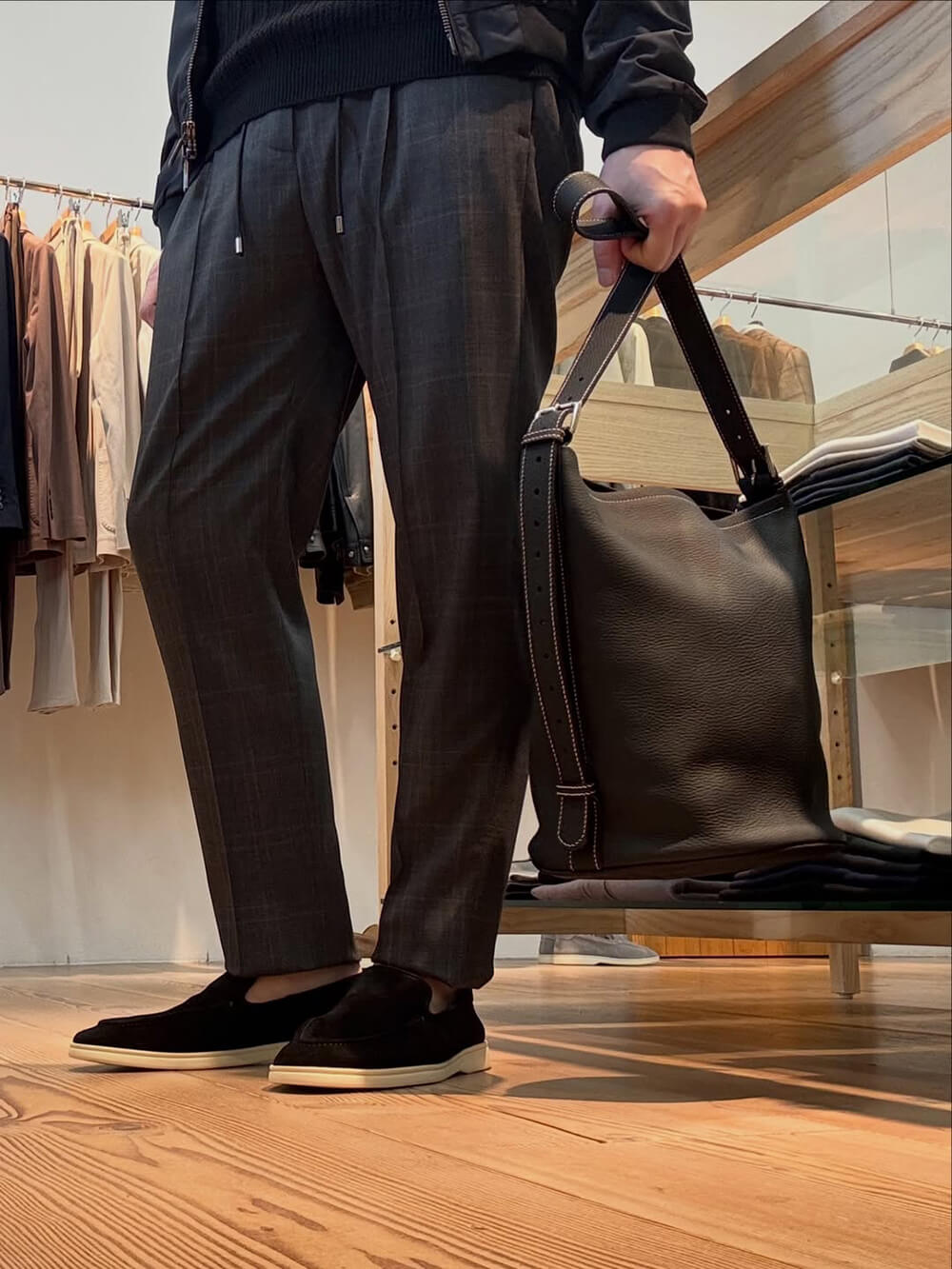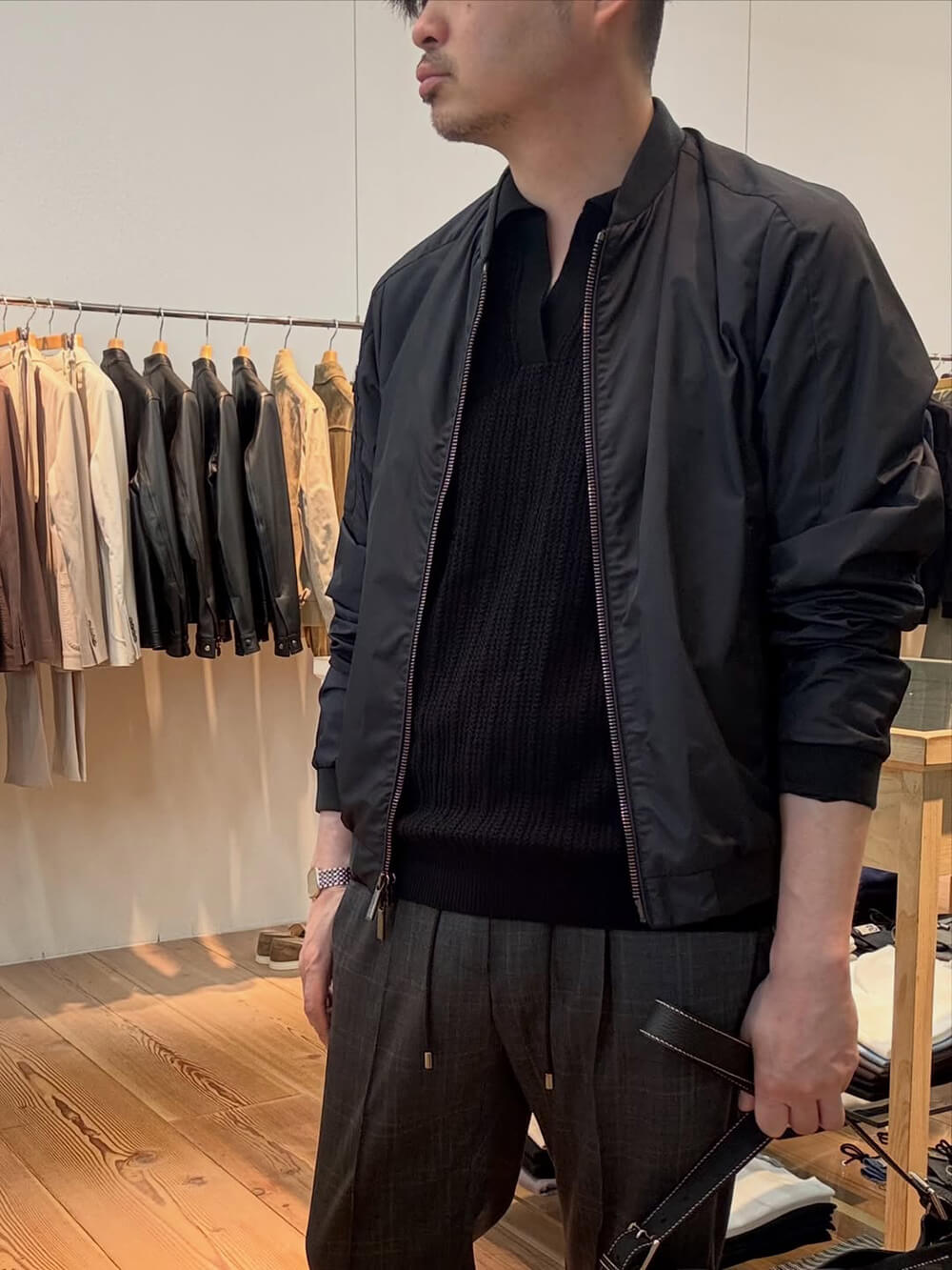 ミリタリー色の強いムーレーのMA-1をニットポロ・ウール素材のパンツ・ローファーで上品に格上げしています。