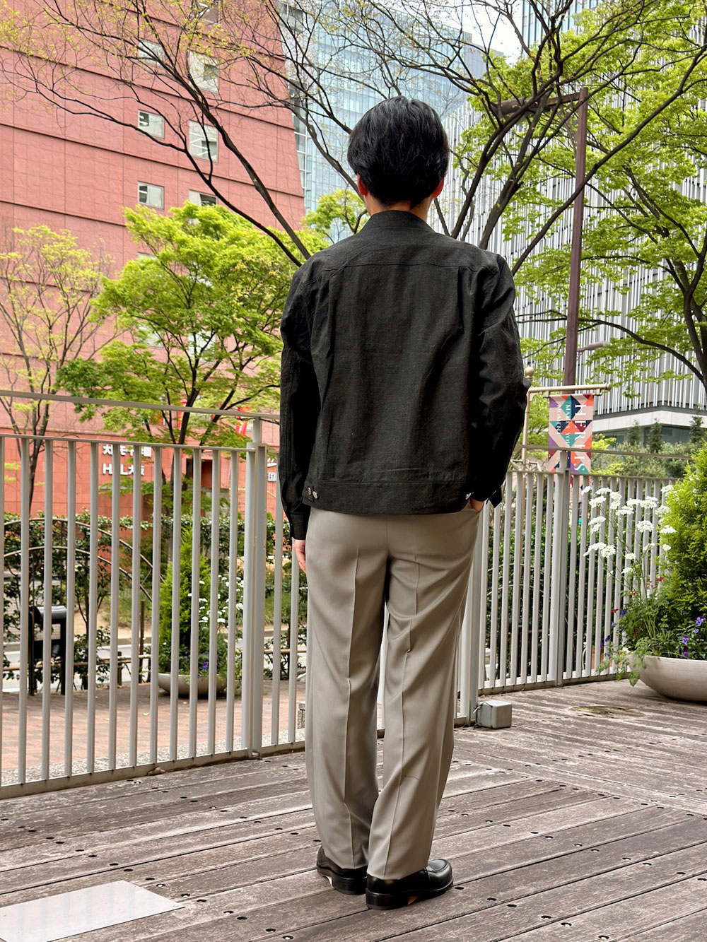 落ち着いたトーンの軽やかなセカンドタイプジャケットに、ゆとりのあるスラックスを合わせることで、リラックス感と美しいシルエットを両立しています。