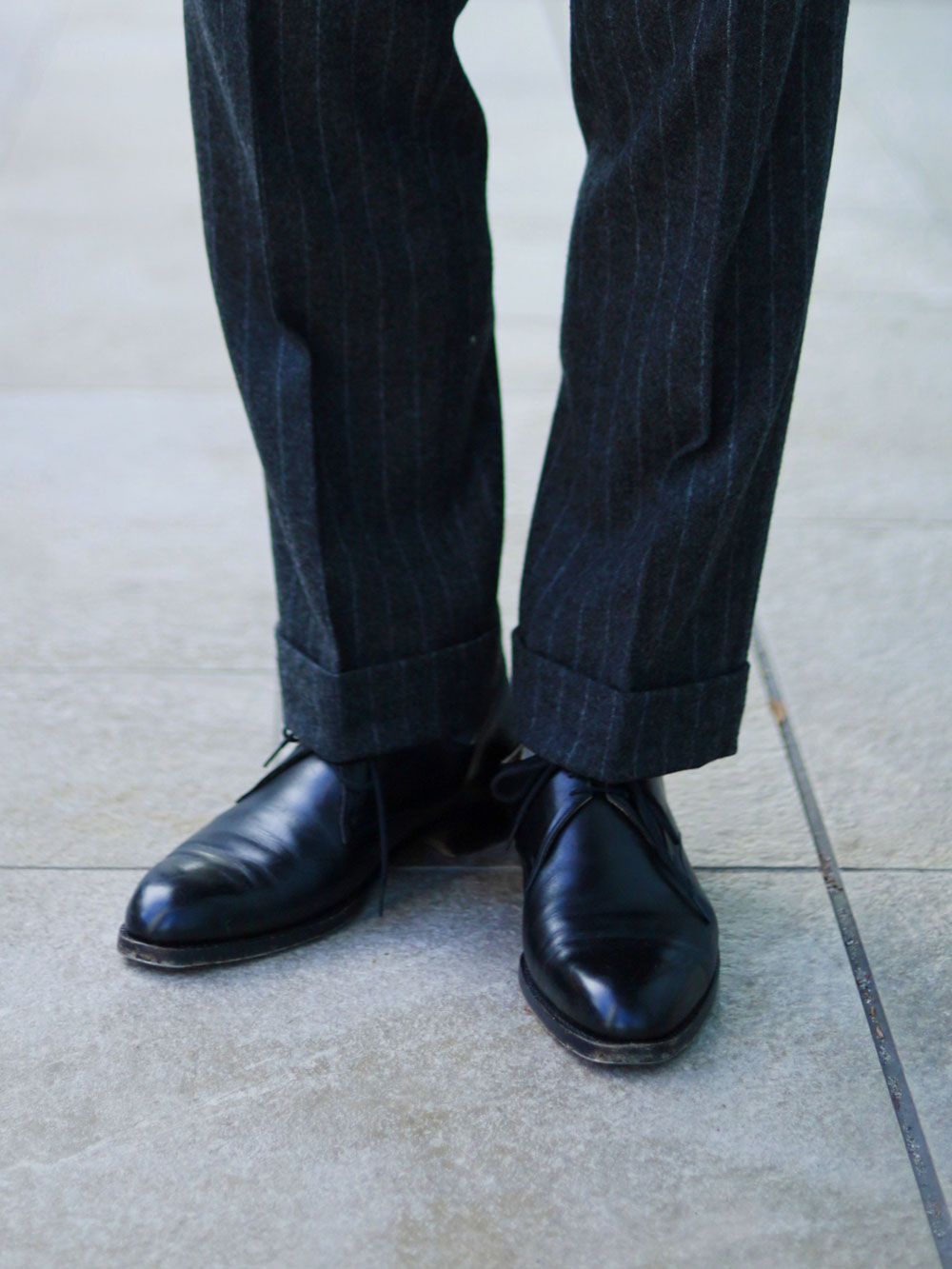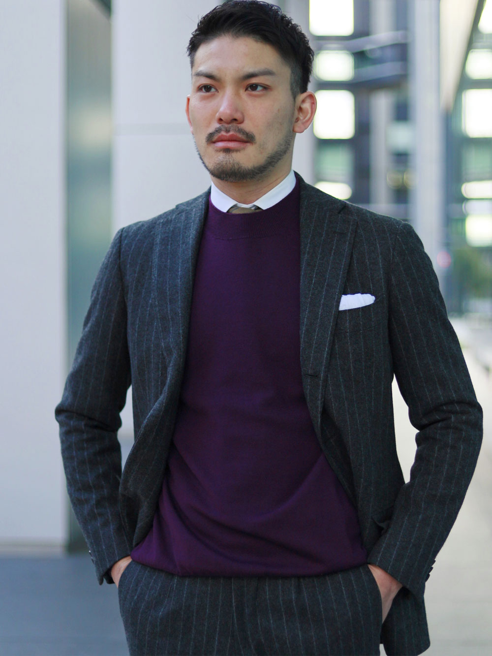 チャコールグレーのスーツに深みのあるパープルの色合わせも