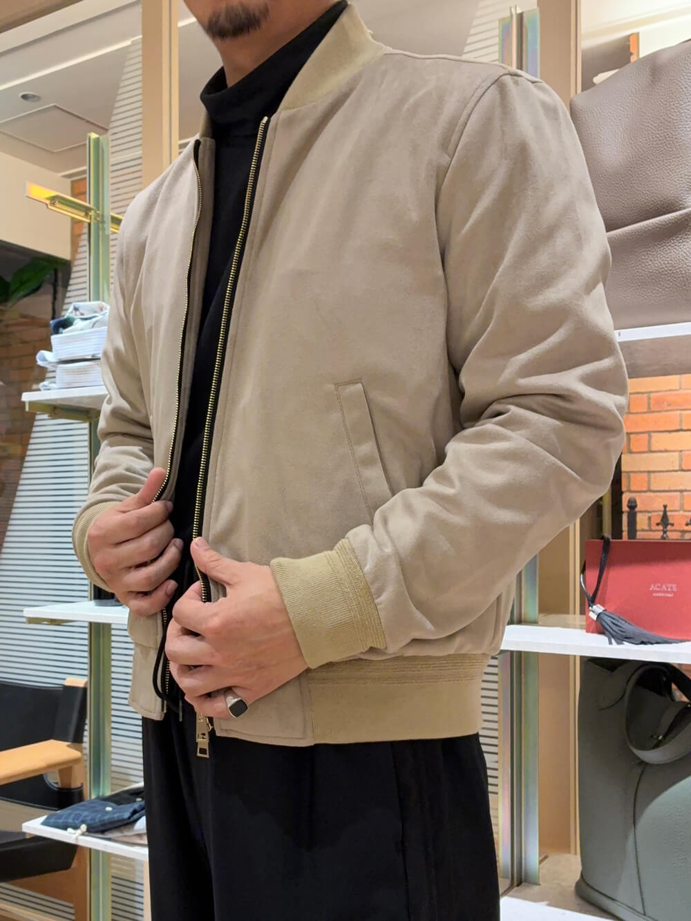 イタリアらしいミニマルなデザインのボンバージャケットはオーバーサイズではなく、ある程度ジャストフィットさせるのが品良く見えるような気がします。