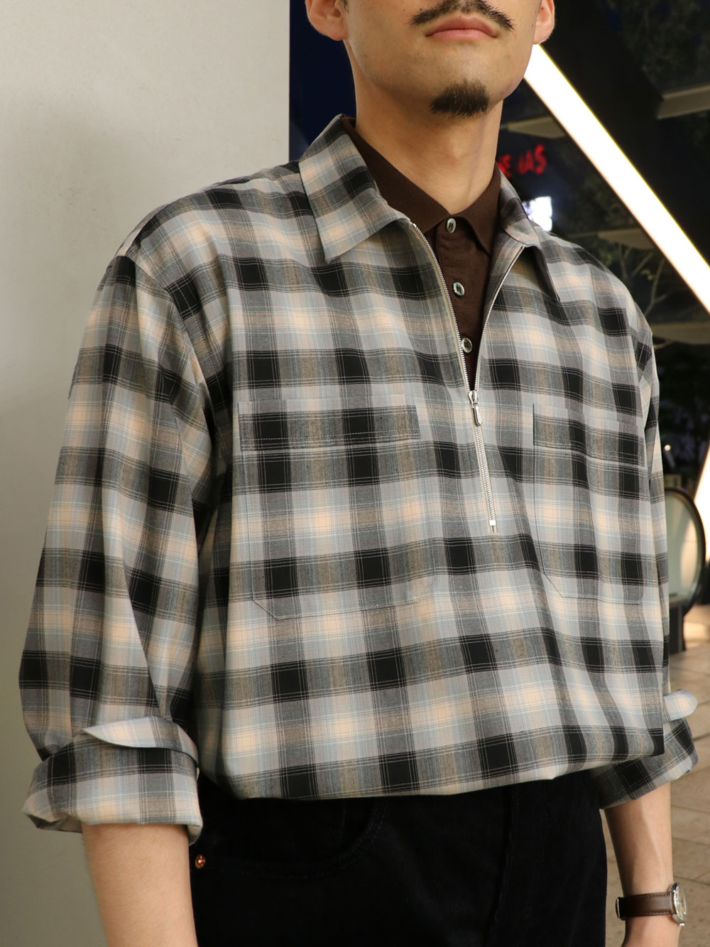 ハーフジッププルオーバーシャツとポロシャツのレイヤードスタイルです。