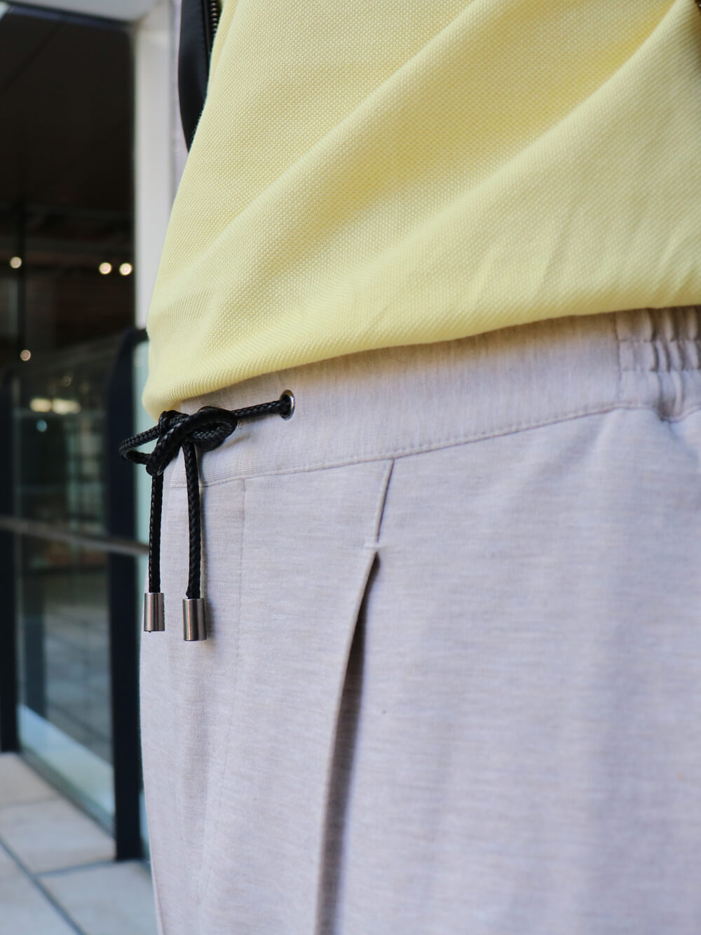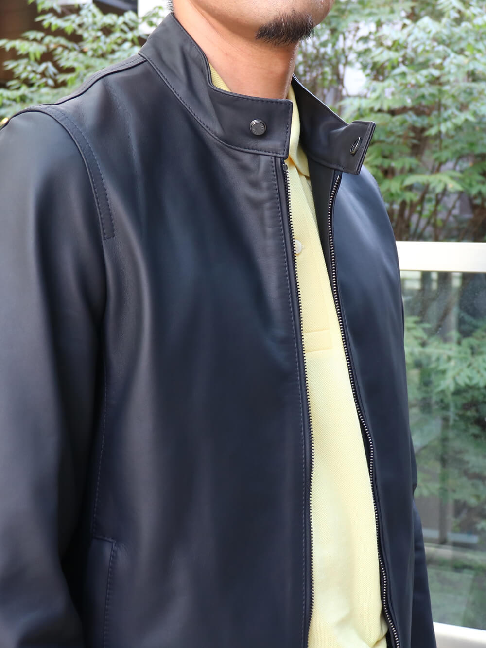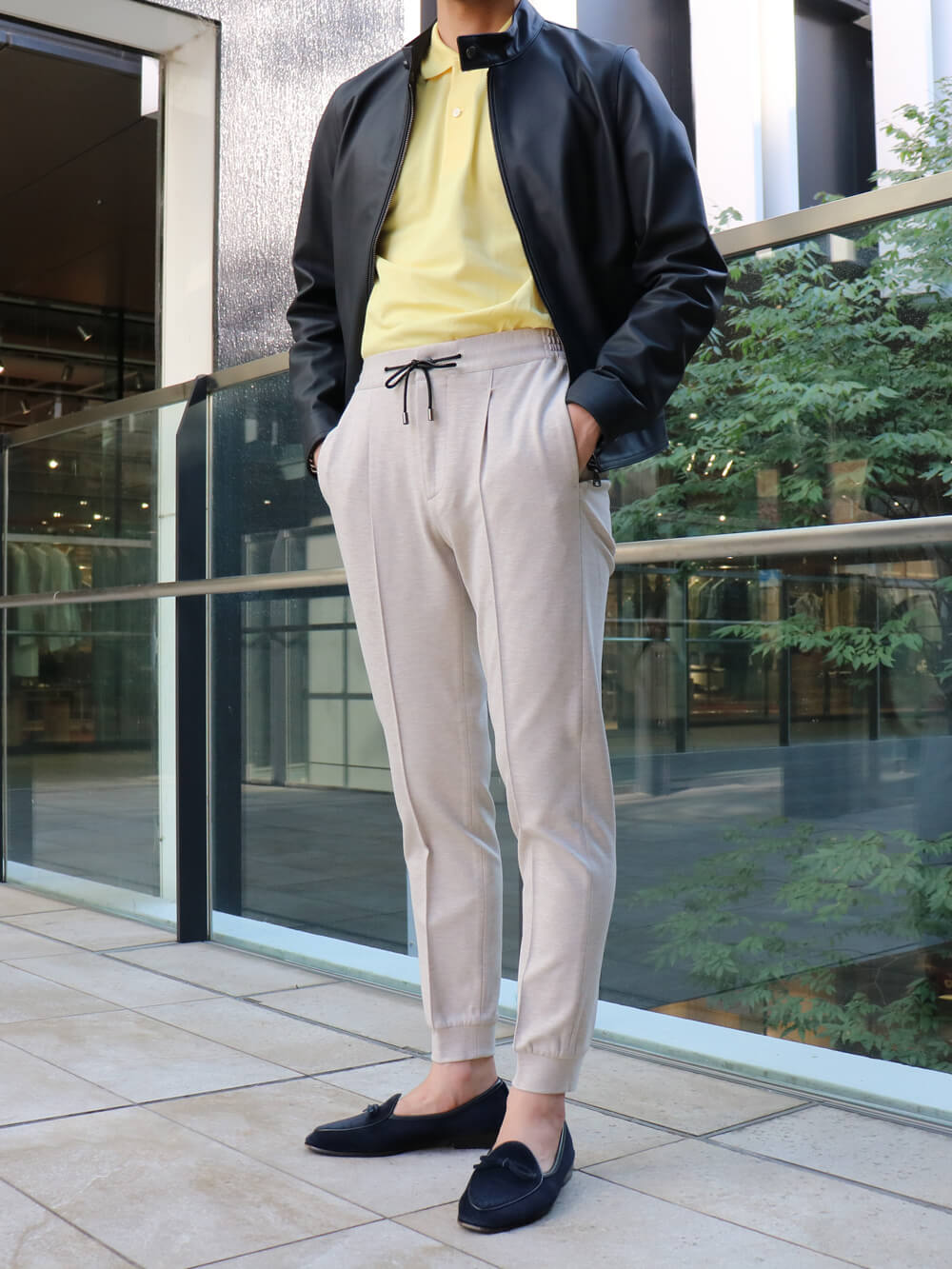 ややグレーがかったダークネイビーのレザージャケットに淡いイエローのポロと淡いベージュのリブパンツを合わせたスポーティースタイルです。