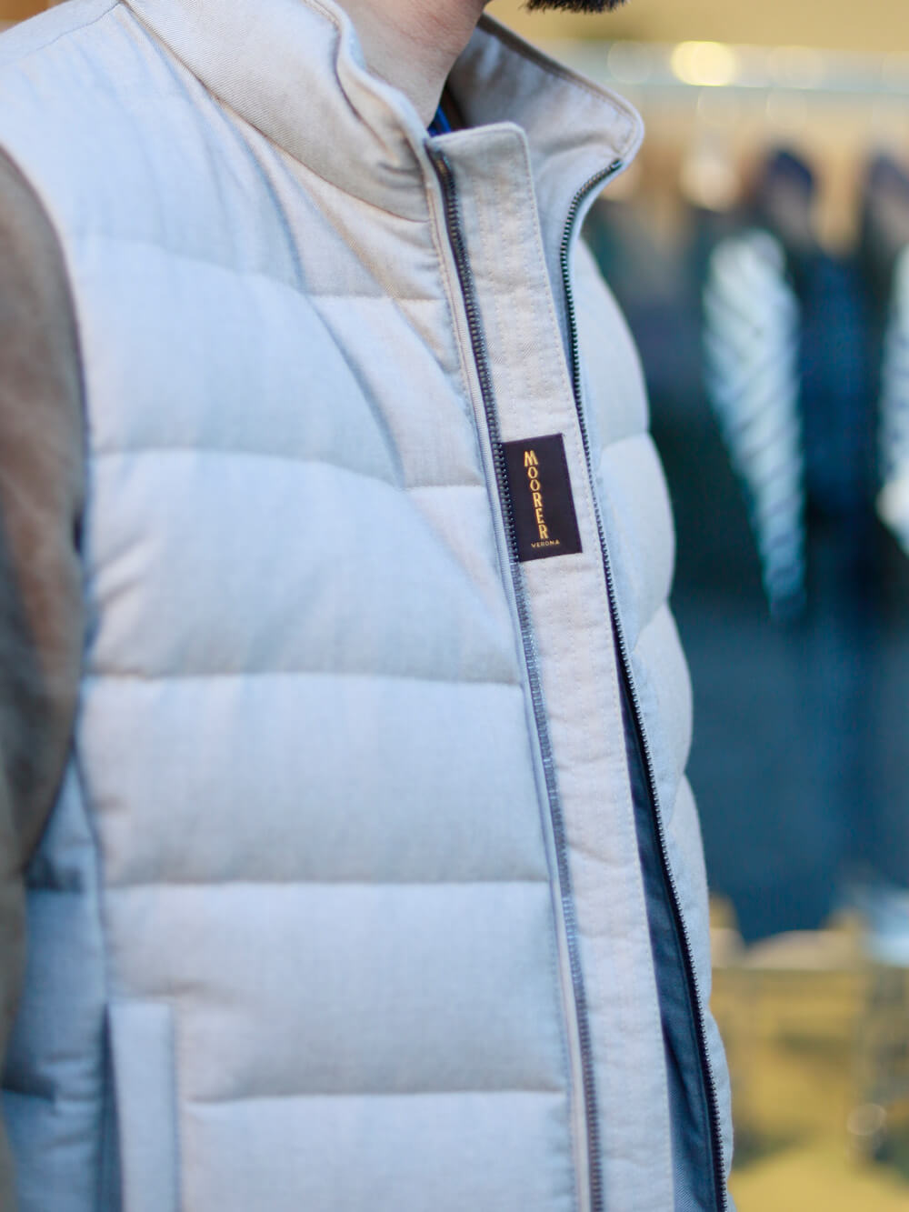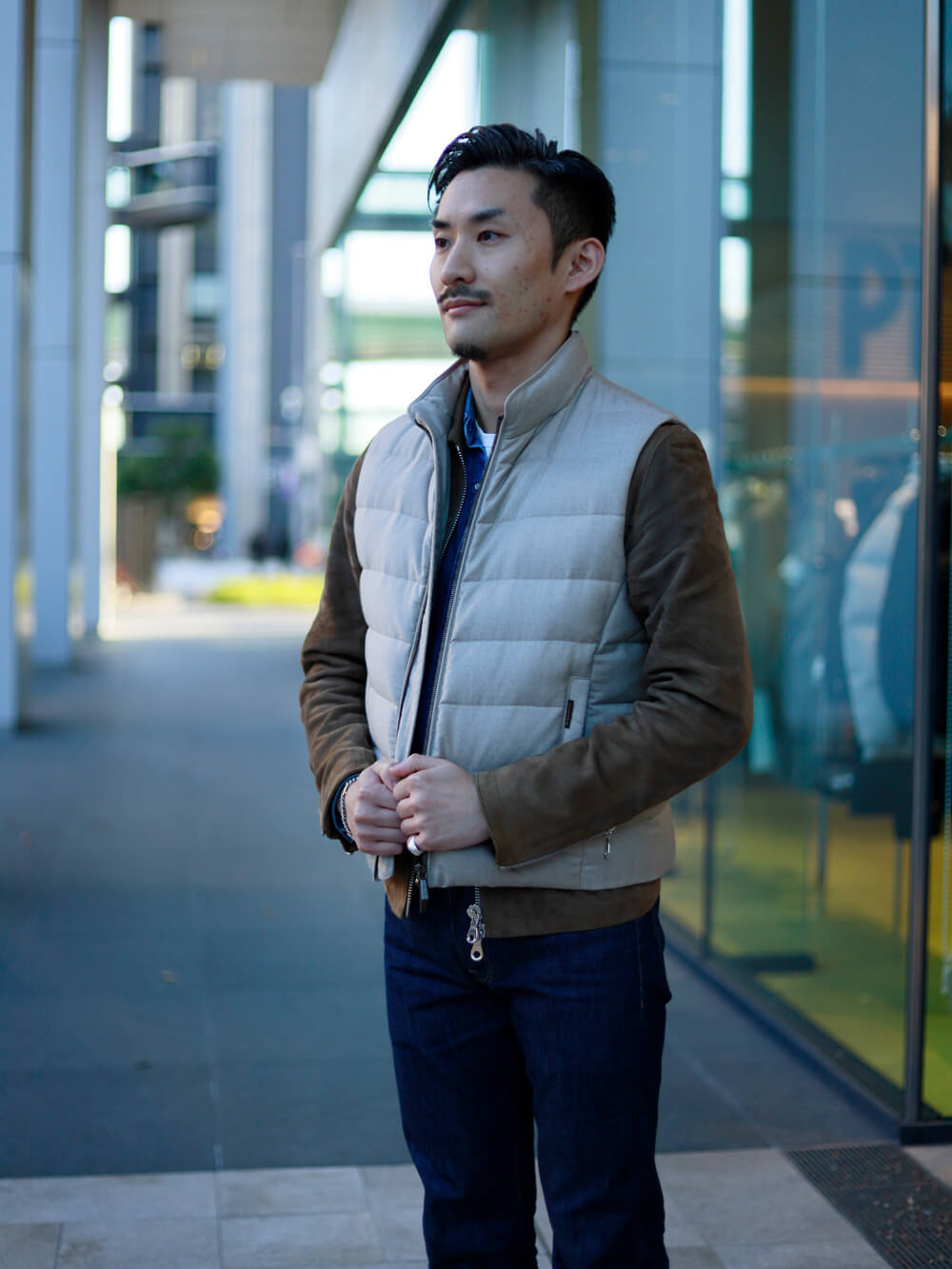 デニム素材のウエスタンシャツとパンツでデニムオンデニム、その上に「ブラウンベージュのスエードブルゾン」と「グレーベージュのウールカシミヤ素材ダウンベスト」でワークスタイルに上品さをプラスした大人のスタイルです。