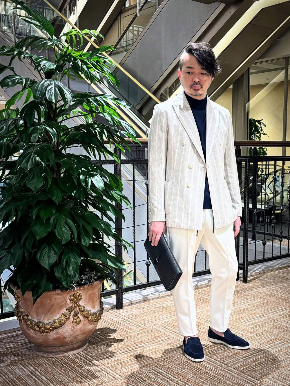 (ホワイト・ベージュ・ライトグレー・チャコールグレー・ネイビーはサイズ48を、ブラックはサイズ50を着用しています)