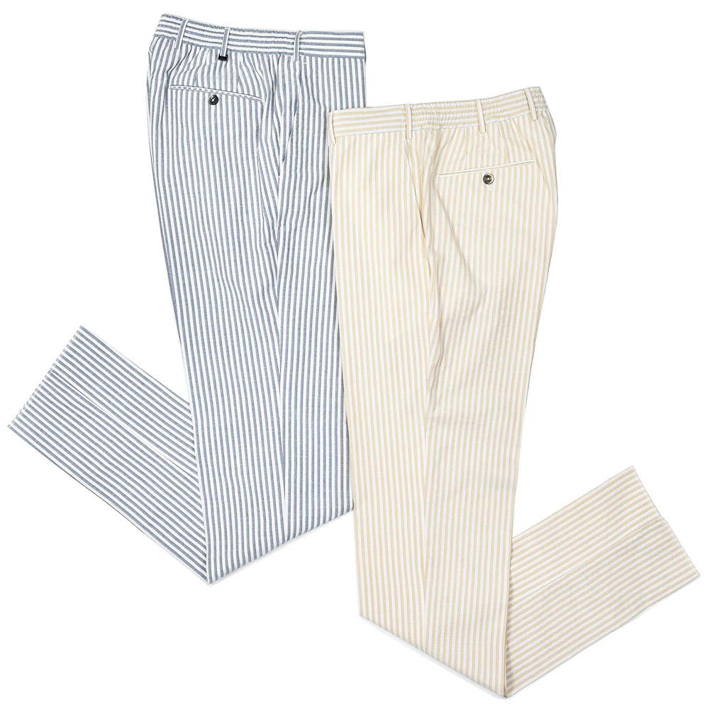 | ひとこと | サイズ50がジャストサイズです。ウエストからヒップ・ワタリにかけてタイト過ぎず、気持ちゆとりはありますがすっきりとしたシルエットです。裾にかけて少しテーパードしたフィッティングです。珍しいネップの入ったサッカーストライプです! |