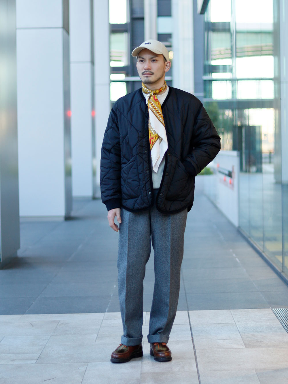 ノーカラーのキルティングジャケットは、アウターとしての着用は勿論のこと、オーバーサイズのコートのインナーに使用しても洒落たスタイルを作り上げてくれます。