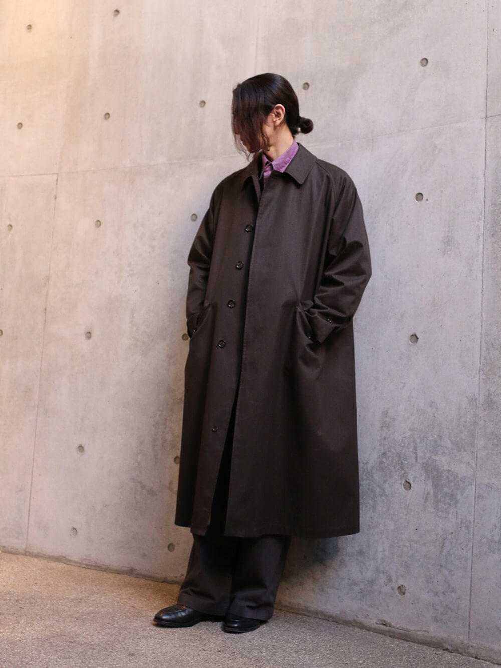 汎用性の高いコットン素材を使用したオーバーコートは、今流れがきているシックなダークブラウンの色味がなんとも言えない雰囲気を醸し出します。